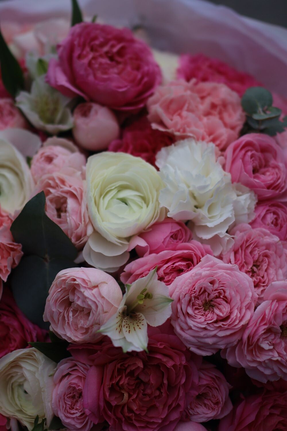 Ранункулюсы, пионовидные кустовые розы, французские розы, гвоздики, эвкалипт альстромерии