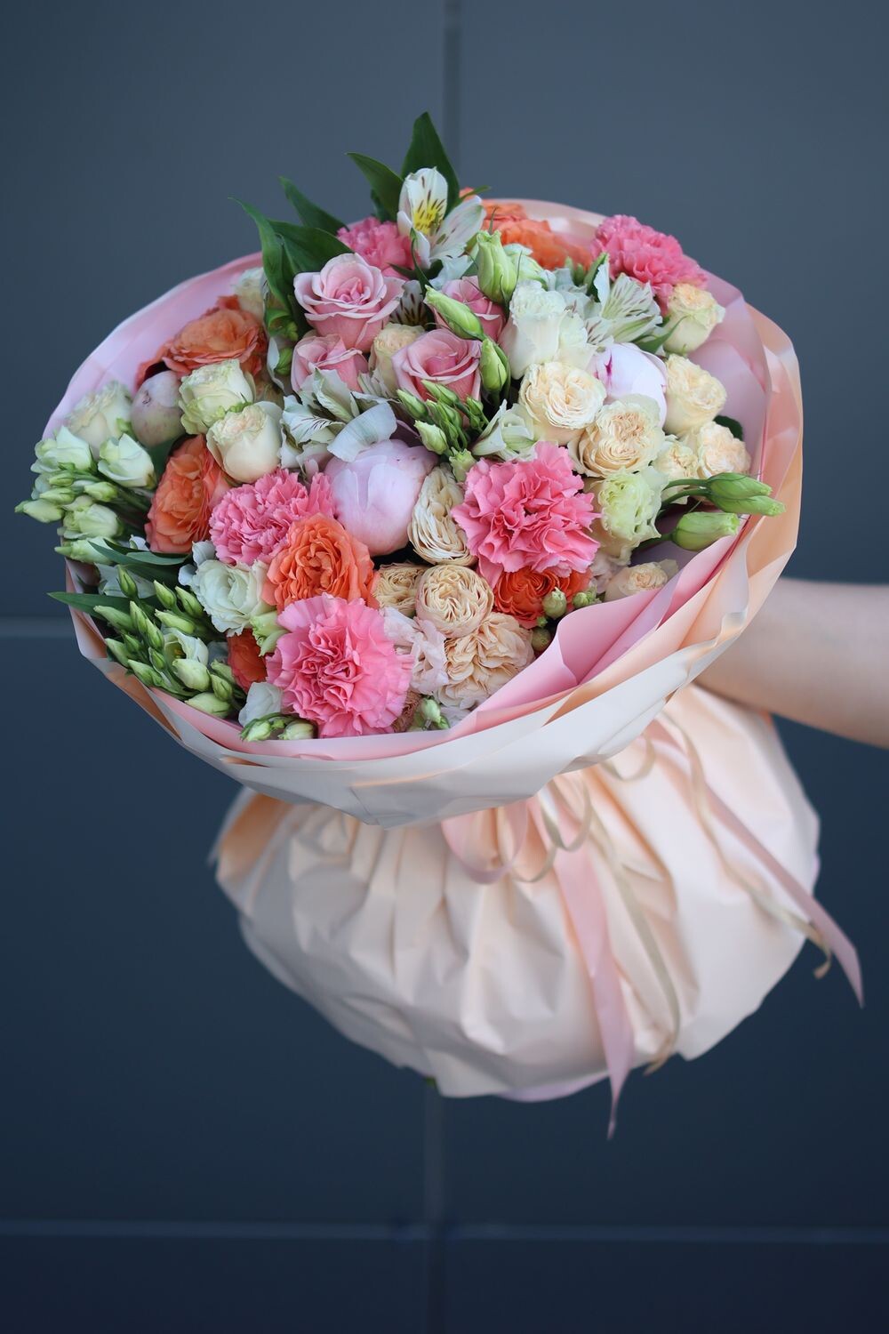 Пионы, гвоздика, альстромерии, кустовые пионовидные розы